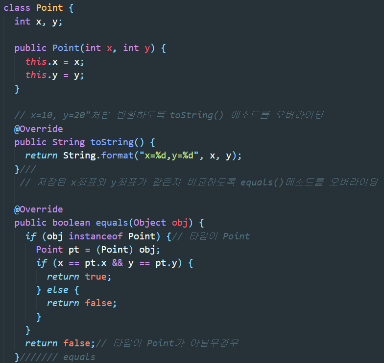 - Object클래스의 equals()메소드는 두 객체간의 주소값을 비교해서 같으면 true 다르면 false를 반환한다.