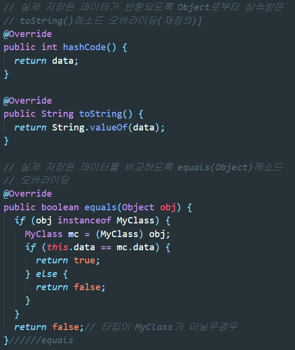 toString()과 equals()는 데이터값을 호출, 데이터값을 비교하는 메소드로 모두 오버라이딩 되었기 때문에 저장된 데이터 값을 활용하여 결과값을 출력한다.