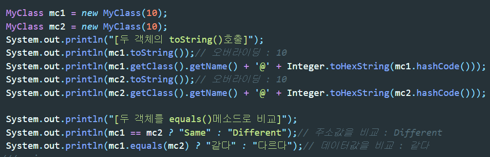 우리가 위 MyClass에서 toStirng()메소드를 오버라이딩 시켜놓았으므로 mc1,mc2 둘다 데이터값이 출력된다.