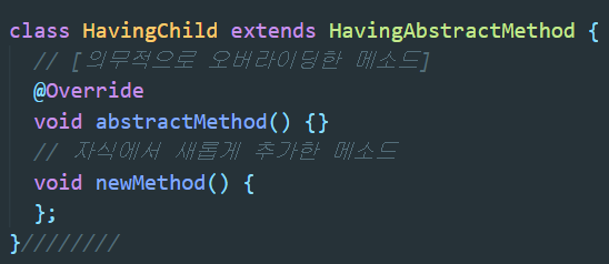 - 만약 자식클래스에서 부모클래스의 추상메소드를 오버라이딩 하지 않으려면 자식클래스도 추상클래스로 만들면된다.