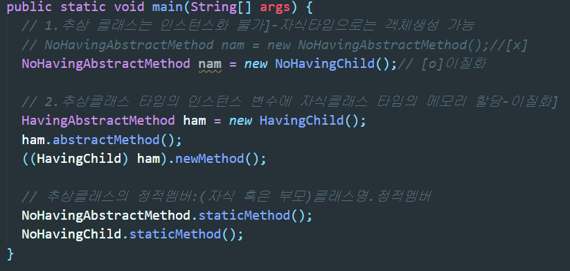 - 추상클래스는 new해서 인스턴스화 할 수 없지만, 추상클래스 타입의 인스턴스 변수에 자식클래스의 메모리를 할당할 수 있다.(Heterogenious)