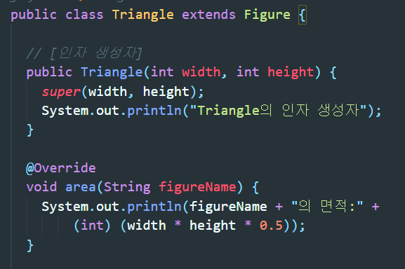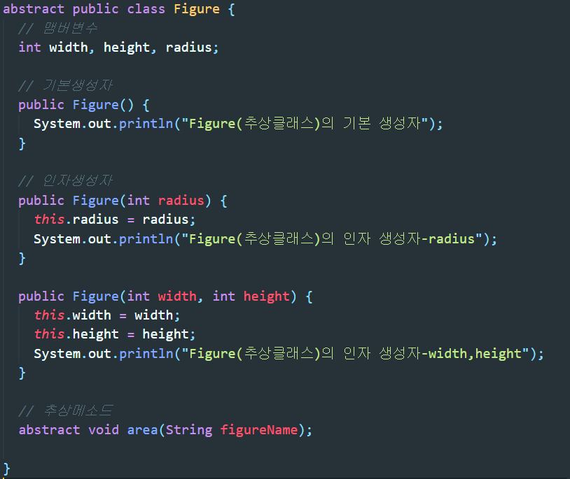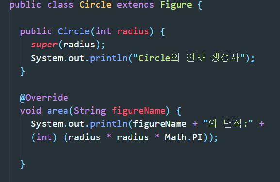 ▲ 우선은 기본생성자와 원의 넓이를 구할 때 사용할 반지름만을 인자로 받는 인자생성자와 삼각형,사각형의 넓이를 구할 때 사용할 길이와 높이를 인자로 받는 인자생성자를 만든 후 모든 도형의 넓이를 구할 때 호출 하기위해 오버라이딩을 위한 추상메소드를 만들었다.