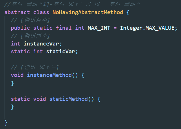 - 단, 추상 메소드가 없어도 class 앞에 abstract만 붙이면 추상 클래스가 될 수 있다.