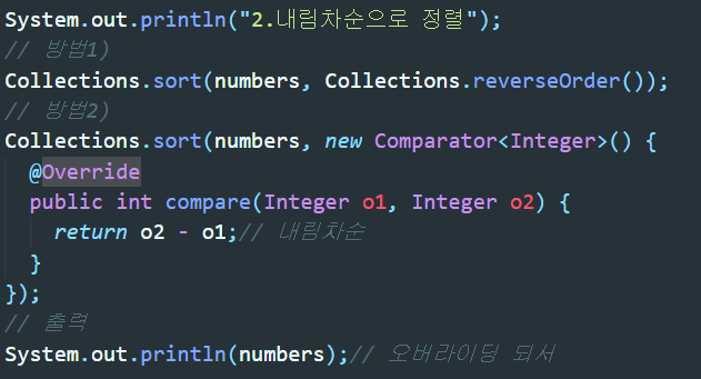 방법2)에서는 역시나 compare()오버라이딩 까지 한 후 오름차순과는 반대로 o2가먼저오고 o1이 뒤에 오는 형식으로 내림차순을 표현한다. 만약 int형 배열이었다면 o2-o1의 형태였을 것이다.