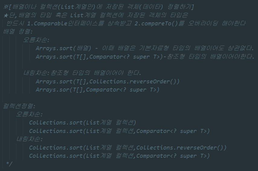 주의사항은 배열의 타입 혹은 List계열 컬렉션에 저장된 객체의 타입은 반드시 Comparable인터페이스를 상속받고 compare()를 오버라이딩 해야한다는 것이다! 참조형클래스들은 기본적으로 Comparable인터페이스를 상속받고있다.
