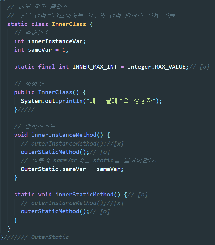 - 외부클래스의 인스턴스형 맴버는 사용할 수 없다.