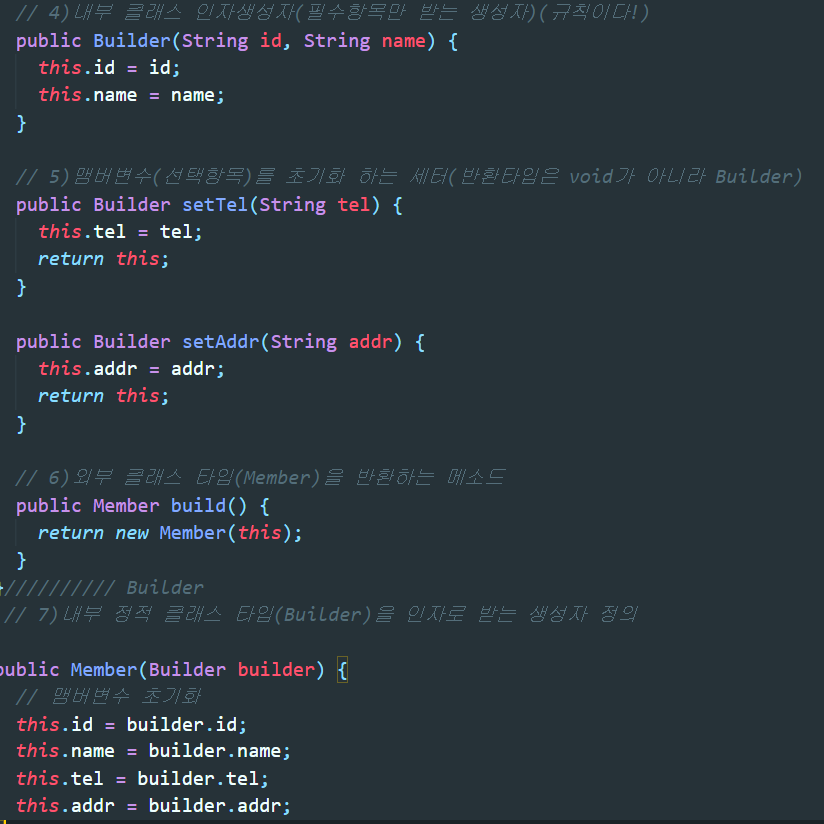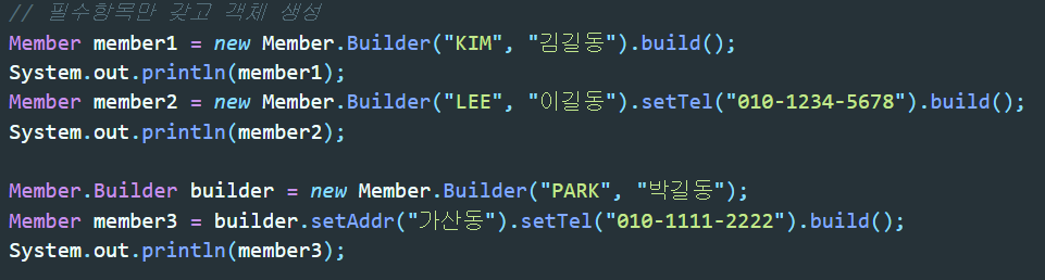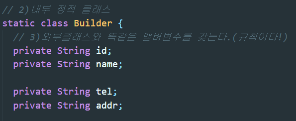 ▲내부클래스에는 꼭 초기화를 하고싶은 필수항목만을 받는 인자생성자를 생성하였고, 선택적으로 초기화를 할 맴버변수를 인자로 받는 인자생성자도 만들었다. 이때 인자생성자들의 반환타입은 모두 내부클래스 타입으로 한다.