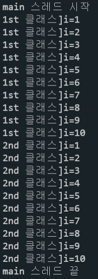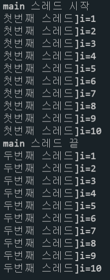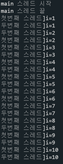 ▲ 결과는 위와 같다. main메소드에서 main스레드시작이라는 문구를 출력한뒤 각각의 for문이 끝나고 main메소드의 마지막에 있는 코드인 main스레드 끝이 실행되면서 좋료된다.