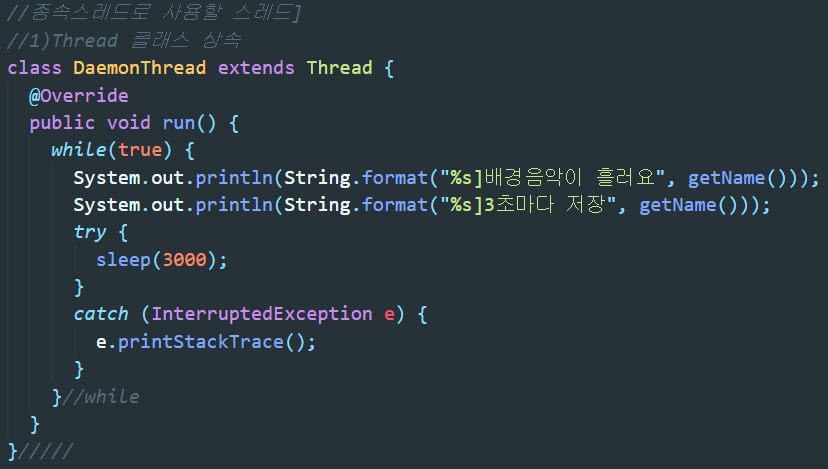 ▲ 종속스레드로 사용할 클래스를 만든다. 종속스레드는 주로 무한루프형식으로 구성해서 주 스레드가 끝날때까지 계속 실행되어야 하기 때문이다. 이 또한 역시 스레드의 상속을 받아야한다.