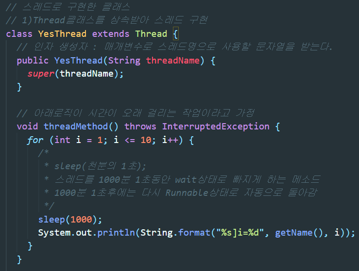 ▲ 스레드로 구현한 클래스를 만들기 위해서 우선 Thread를 상속받아 Thread의 맴버를 사용할 수 있게한다. 스레드는 생성자 안에 String타입의 문자열을 넣어주면 해당 스레드명으로 사용할 수 있는 기능이있다.