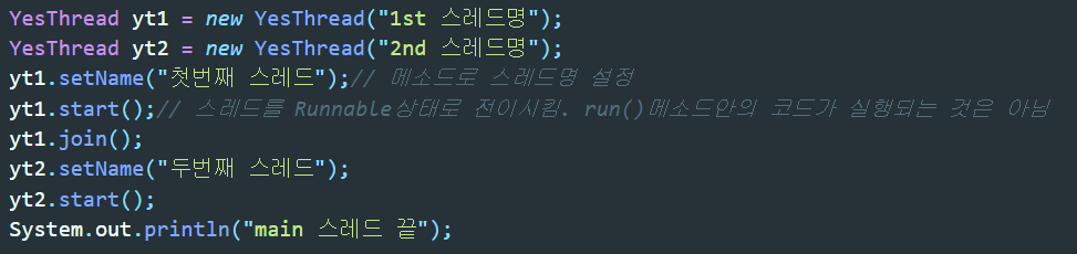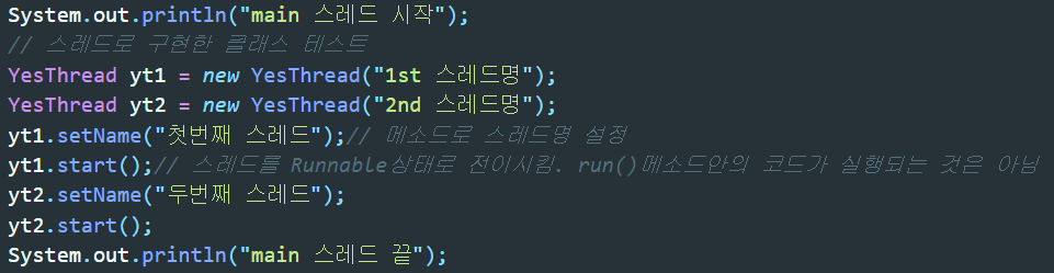 ▲ 스레드는 스케줄러에 의해서 임의의 순서로 실행이 된다. 가장 먼저실행되는 것은 main메소드에 들어왔을 때의 첫번째 코드인 main 스레드 시작이 먼저 실행되고 이후 yt1.start()를 통해서 실행가능상태(Runnable)상태로 진입하고 yt2.start()도 동일하다. 이후 main 스레드 끝 코드가 실행된 후 스케줄러에 의해 yt1과 yt2은 스케줄러의 마음대로 임의의 순서대로 실행되고 sleep()을 통해 wait상태로 갔다가 다시 실행가능상태(Runnable)상태로 가서 스케줄러의 명령을 기다리게 된다. main메소드는 끝났지만 yt1과 yt2클래스는 for문이 다 돌때까지 스케줄러의 실행,sleep,Runnable,Running,Rung상태를 반복하는 것이다.