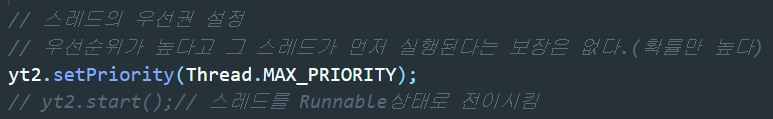 ▲ 모든 스레드는 default로 우선순위값이 5로 되어있다. 여기서 우선순위값이 높을 수록 우선되어진다는 것인데 setPriorty()로 우선권을 최대로 높여줘도 무조건 먼저실행되는 것은 아니다. 단순히 확률이높아질 뿐이다.