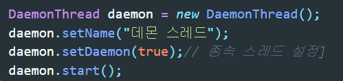 - 어떤 스레드를 종속 스레드로 만들려면 setDaemon(true)로 설정하면 된다.