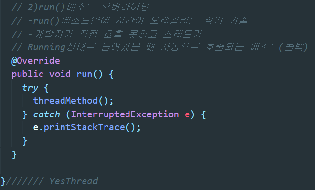 ▲ 마지막으로 Thread클래스에 있는 run()메소드를 오버라이딩 시키면 준비가 끝나게 된다.