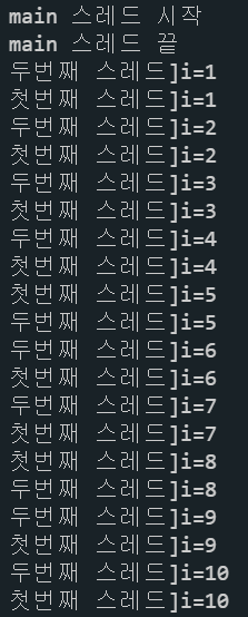 매번 실행시킬때마다 첫번째 스레드와 두번째 스레드의 순서는 랜덤하게 출력된다.