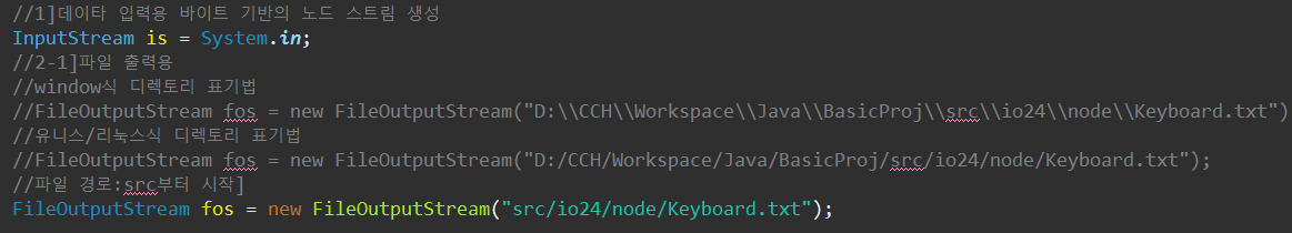 키보드로 입력한 값들을 파일로만들어서 저장을 위해서는 FileOutputStream을 사용해야한다. OutputStream 역시 바이트 기반의 값을 출력장치로 1byte씩 전송해주기 때문이다.