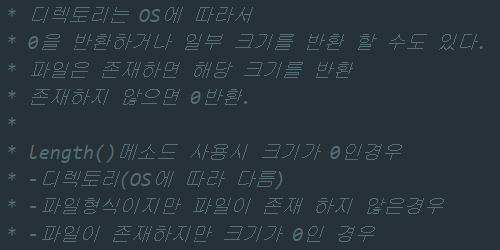 length()메소드는 파일 또는 디렉토리의 크기를 얻는 메소드이다. 단위는 byte로 크기를 가져오며 반환타입은 long형이다.