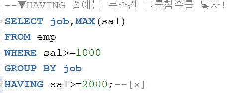 - 그룹에 대한 조건은 HAVING절에서 기술해야 한다.