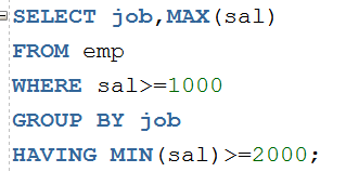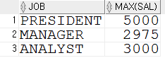 ▲ emp테이블에서 연봉이 1000이상인 사람들을 job으로 그룹핑하는데 최소연봉이 2000이상인 사람들만 가지고 그룹핑한다. 그리고 그 사람들의 직책과 최대연봉을 출력