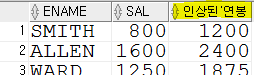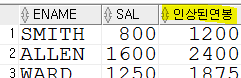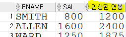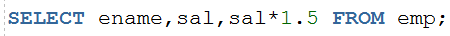 ▲ emp테이블에서 ename, sal, sal의 1.5배(150%) 열 순서로 조회 및 출력한다.