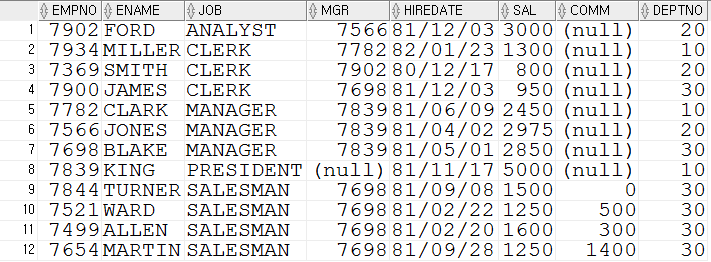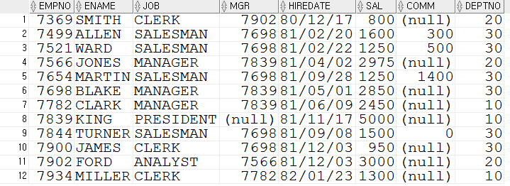 ▲ emp 테이블에서 모든열을 조회 및 출력한다.