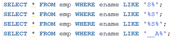 ▲ emp테이블에 이름이 S로 시작하는, S로 끝나는, S가 들어가는, A문자가 세번째 위치하는 사람들의 모든 데이터 출력