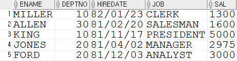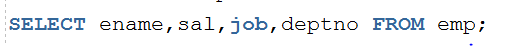 ▲ emp테이블에서 ename, sal, job, deptno 열 순서로 조회 및 출력한다.