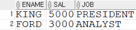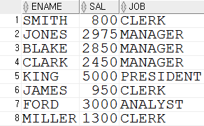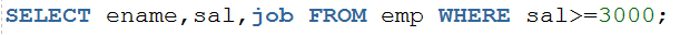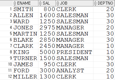 ▲emp테이블에서 sal(연봉)이 3000이상인 사람들의 이름, 연봉, 직책을 출력