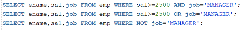 ▲ 첫줄부터 순서대로 연봉이 2500이상이면서 직책이 MANAGER인 사람들의 이름,연봉,직책을 출력, 연봉이 2500이상이거나 또는 직책이 MANAGER인 사람의 이름,연봉,직책을 출력, 마지막으로 직책이 MANAGER가 아닌 사람들의 이름,연봉,직책을 출력