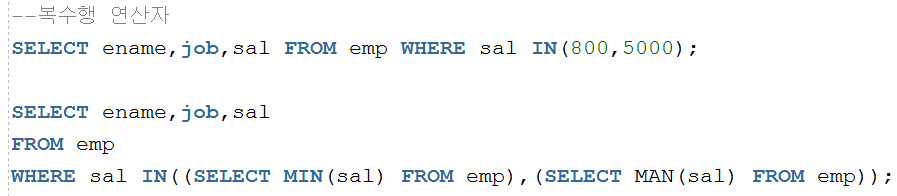 - 단일행 서브 쿼리에는 단일행 연산자를 다중행 서브쿼리에는 복수행 연산자를 사용한다.