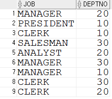 ▲ job이 MANGER이면서(AND) deptno가 20인 사람을 중복체크해서 하나만 출력되고, job이 SALESMAN 이면서(AND) deptno가 30인 사람을 중복체크해서 하나만 출력되게하고.... 이런식으로 중복체크를 한다.