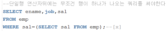 ▲ 단일행 연산자 뒤에는 무조건 행이 하나가 나오는 쿼리를 사용하자