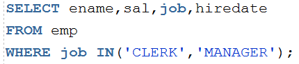 ▲ 위 두 코드는 동일한 내용이다. 직책이 CLECK이거나 또는 MANGER인 사람의 이름,연봉,직책,고용날짜 출력