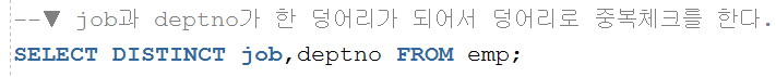 - DISTINCT뒤에 여러 개의 컬럼을 기술하였을 때 나타나는 행은 컬럼의 조합(AND조합)들이 중복되지 않게 나타난다.