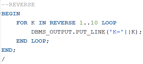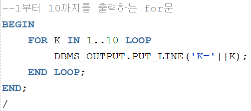 | 예] FOR 인덱스 카운터 IN [REVERSE] 초기값 .. 종료값 LOOP statement1; statement2; END LOOP; |