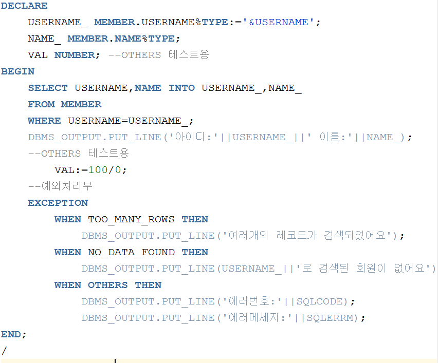 ▲ 사용자에게 입력받은 아이디로 회원을 검색했을때 테이블에 해당 ID로 저장된 레코드가 없으면 NO_DATA_FOUND EXCEPTION이 발생하므로 마치 JAVA의 TRY~CATCH절 중 CATCH절과 같이 예외처리를 해줬다. 마지막에는 JAVA에서 EXCEPTION클래스 같은 기능을 하는 OTHERS를 이용해서 그 이외의 모든 에러시 에러번호와 해당 에러의 메세지를 출력하게 예외처리를 하였다.