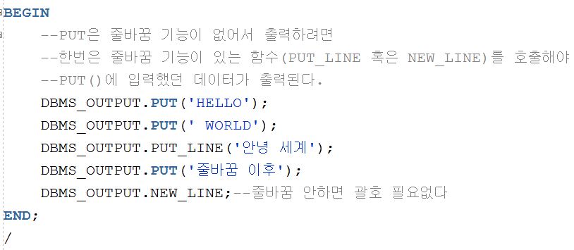 DBMS_OUTPUT.PUT('줄바꿈 안하는 함수'); ->\r\n이 붙어야 출력된다.
