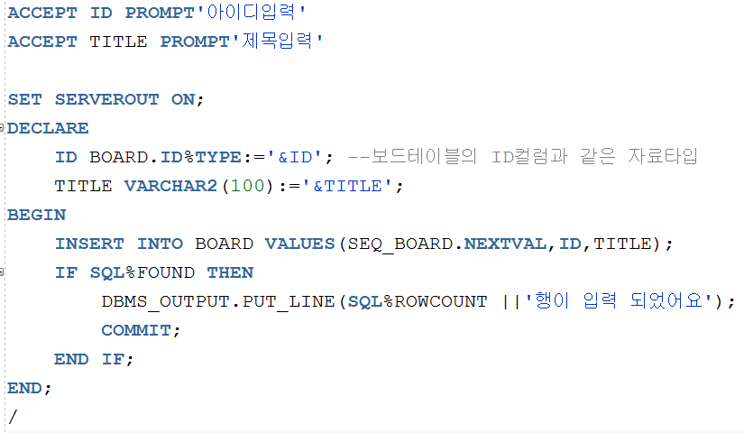 PL/SQL문 밖에서 선언된 변수를 PL/SQL문 안에서 사용할 때는 앞에 '&'를 반드시 붙여서 구분하도록 하자!