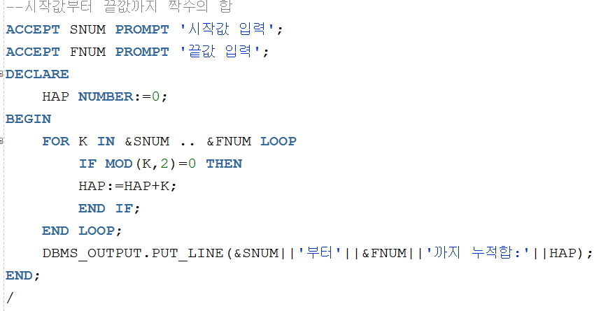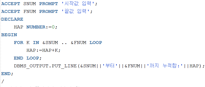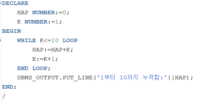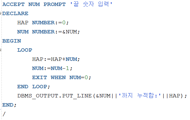 ▲ 사용자가 입력한 숫자까지의 누적합을 구하는 코드인데, 사용자가 입력한 숫자부터 0까지 1씩 감소하면서 누적합을 구한다. LOOP문에서 WHEN NUM=0; 이 되는순간 EXIT가 작동해서 LOOP문을 종료하고 빠져나와서 누적합값을 출력하게 된다.