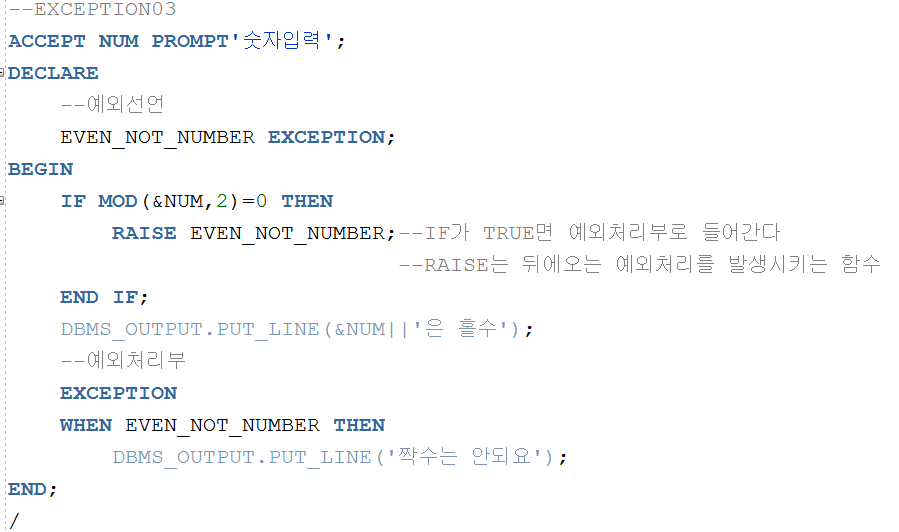 ▲ 만약짝수를 입력하면 IF문의 조건이 TRUE가 되어 IF문안으로 들어간다. IF문안의 실행코드는 RAISE로 말 그대로 일으키다. 즉, EVEN_NOT_NUMBER라는 사용자가 만든 예외를 발생시킨다. RAISE가 실행되면 해당 예외가 처리되는 곳으로 이동하게 되며 위 코드에서는 IF문이 종료되어 EXCEPTION부분으로 들어가서 '짝수는 안되요'가 실행될 것이다.