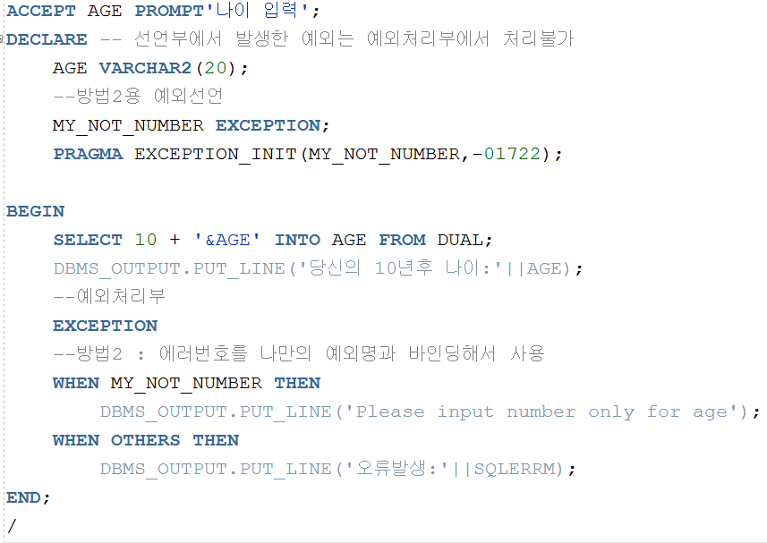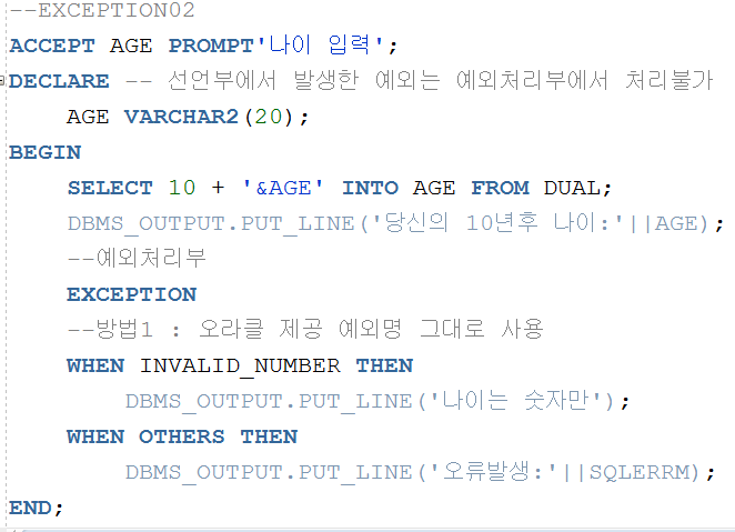 ▲ 숫자 10과 문자는 JAVA에서처럼 자동변환되어 연산될 수 없기 때문에 &AGE는 반드시 숫자만 입력받아야 한다. 만약 숫자가 아닌 것을 입력하게되면 INVALID_NUMBER 에러가 발생한다.