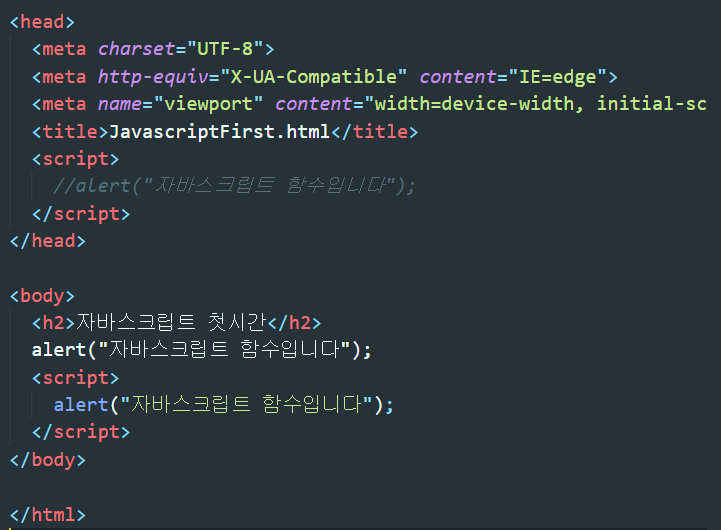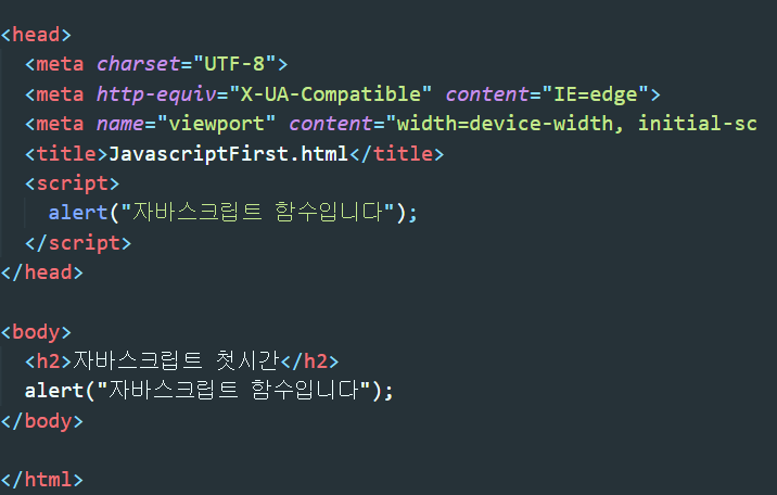 ▲가장 위쪽에 있는 script태그의 alert()함수가 가장 먼저 실행되고 여기서 확인을 누르면 그 다음 코드인 script태그가 실행된다.