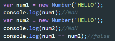 new Number('HELLO')도 NaN이고 new Number('안녕')도 NaN이다. 따라서 결과는 NaN이지만 그 값 HELLO와 안녕인 것처럼 값이 다를 수 있기 때문에 JS내부적으로도 무조건 false가 반환된다. 설사 같은 HELLO로 NaN이 나왔다고 하더라도 NaN끼리비교는 false가 나온다.
