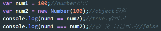 ▲ 값은 100으로 같지만 타입이 num1은 number이고 num2는 object이므로 ===비교연산에서는 false가 나온다.
