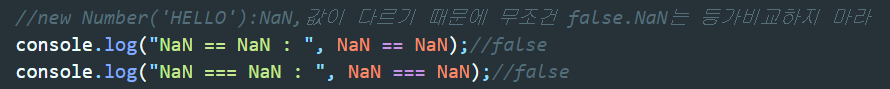 ▲ NaN끼리는 등가비교하면 무조건 false이기 때문에 비교하는 의미가 없다. NaN은 '숫자가 아니다'라고 하는 것이므로.