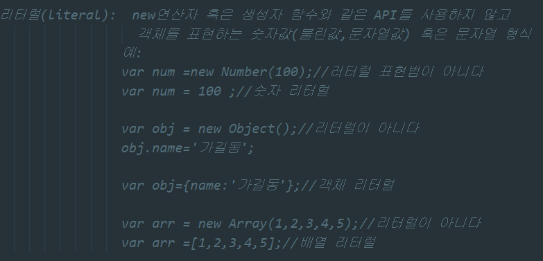 ▲ JS에서는 new 연산자 혹은 생성자함수 등을 사용하지 않고 객체를 표현하면 그 형식을 리터럴이라고 한다.