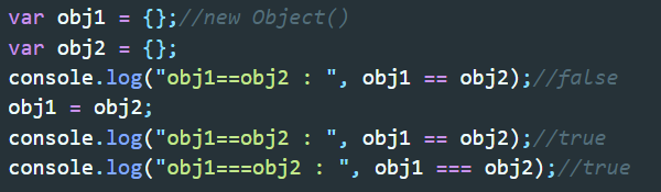 ▲obj도 기본적으로 ==연산을 하면 object와 동일하게 false가 나온다. 하지만 obj1에 obj2의 주소값을 대입하므로써 두 변수가 모두 같은 객체를 참조하고 있기 때문에 ==연산과 ===연산 모두 true가 나온다.