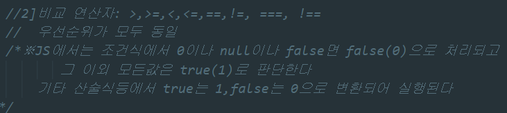 ▲ JS에서는 조건식에서는 0이나 null이나 false면 false로 처리되고, 그 이외의 오든 값은 true로 변환 및 판단되는 특징이 있다. 또한 기타 산술식등에서 true는 1로, false는 0으로 변환되어 실행되는 특징이 있다.