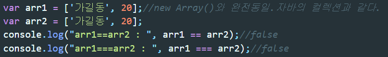 만약 위 배열예제에서도 arr1=arr2를 하여 arr1에 arr2가 참조하고 있는 객체의 주소값을 넣어 같은 객체를 참조하게 되면 ==연산과 ===연산 모두 true가 나오게 된다.