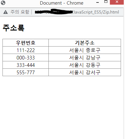 ▲ 우편번호버튼을 누르면 우리가 미리 만들어둔 zip.html파일에 저장된 주소데이터를 팝업창으로 불러와서 데이터를 선택하면 각각의 input 창에 맞는 값을 넣어주는 기능을 만들어보자.